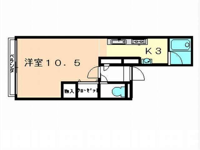 | 詳細間取 | 1R (洋10.5帖×1、キッチン3帖) | ||
